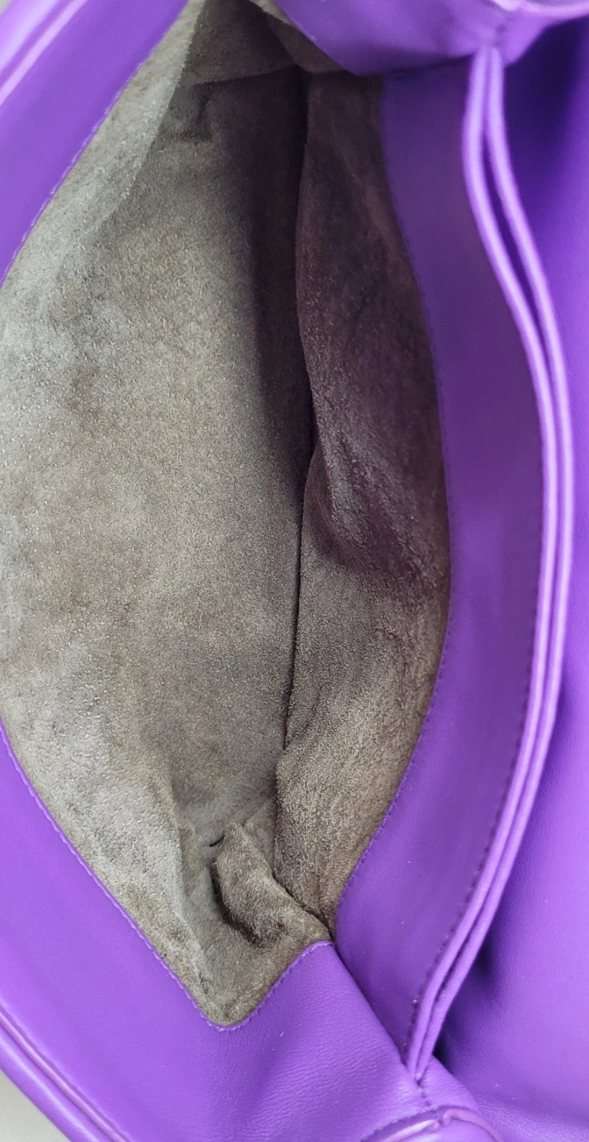 The Bottega Veneta Intrecciato Woven Purple Leather Shoulder Bag is a luxurious and stylish accessory perfect for women. Made from high-quality leather with a unique woven pattern, this bag features a black metal handle and black hardware accents. The interior is lined with suede and has a beige lining, adding a touch of elegance. This shoulder bag from the Bottega Veneta Woven collection is a must-have for fashion-forward individuals looking for a chic and sophisticated accessory. All sales final