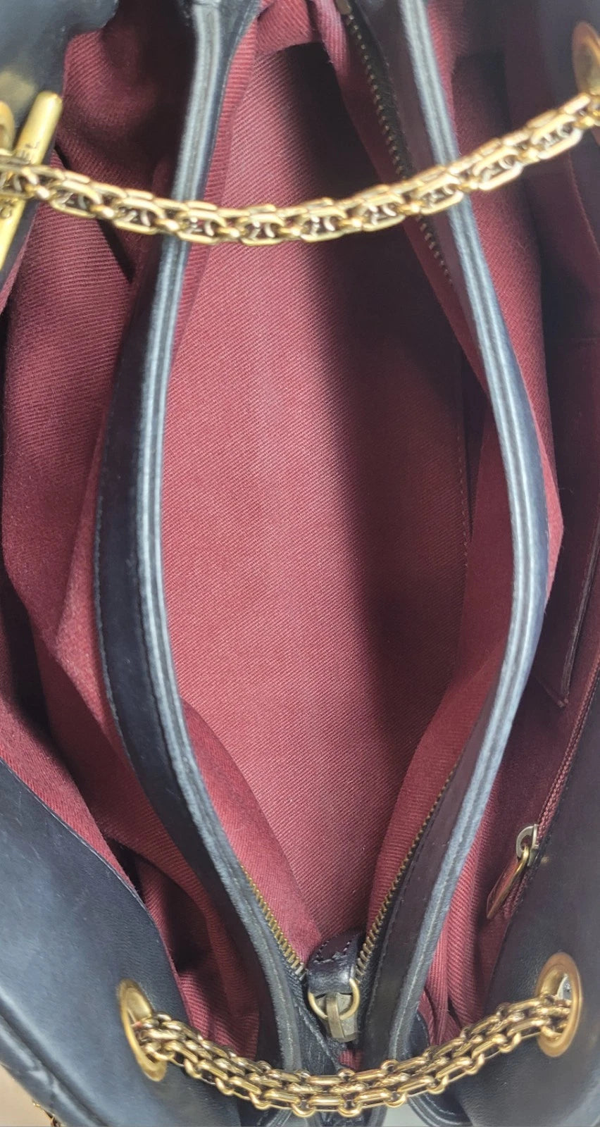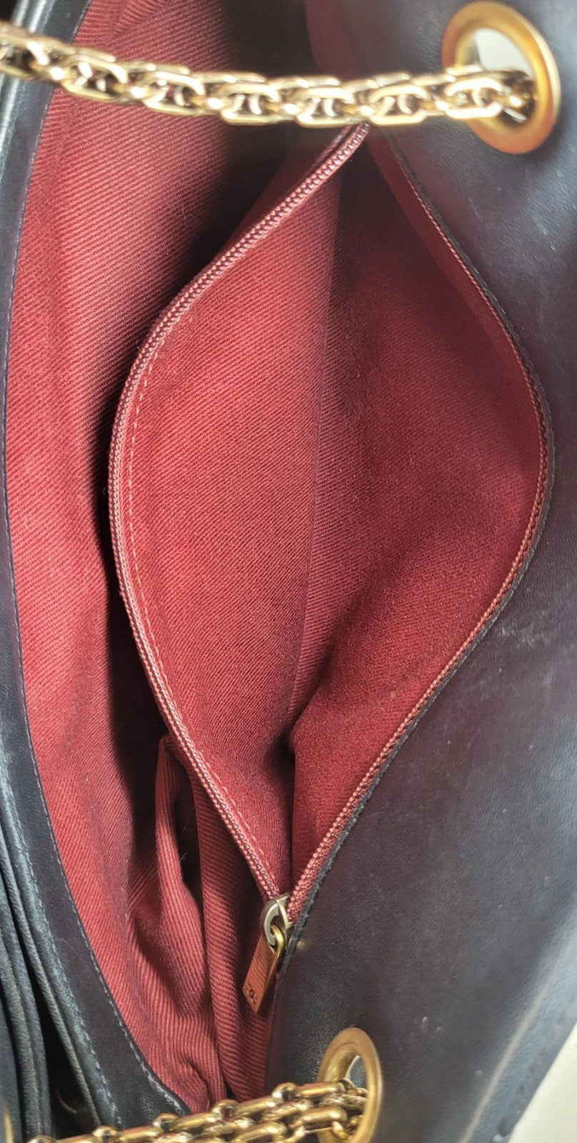 The Chanel Black Lambskin Mademoiselle Bowler Bag is a luxurious shoulder bag designed for women. Crafted from high-quality leather with a gold metallic handle/strap, this bag exudes elegance and sophistication. The iconic Chanel Mademoiselle design features a bow detail and a red canvas lining, adding a touch of feminine charm to the classic black exterior. The gold hardware complements the overall stylish and chic aesthetic of the bag, making it a coveted accessory for any fashion-forward woman.