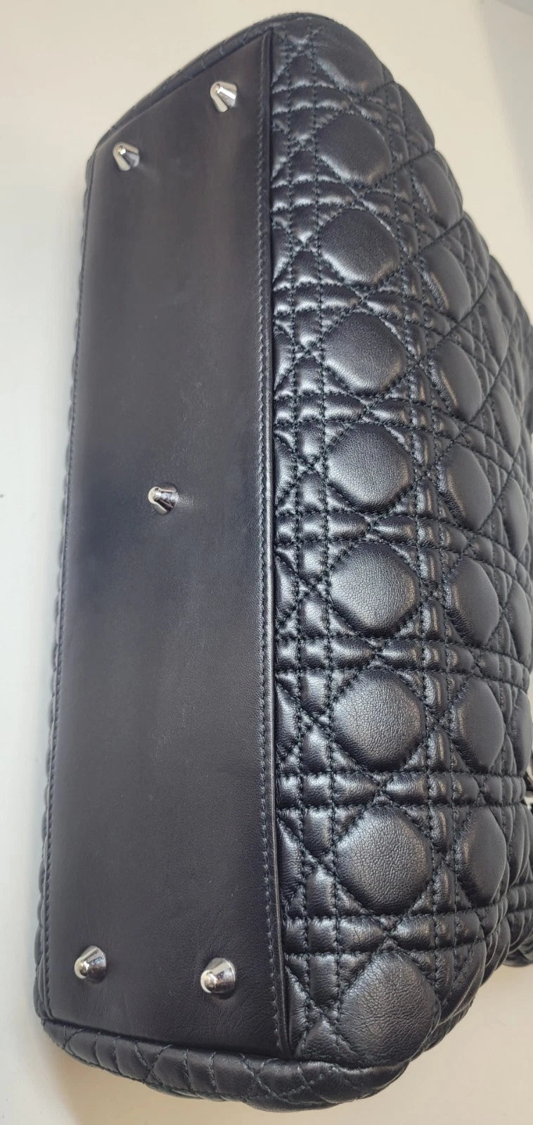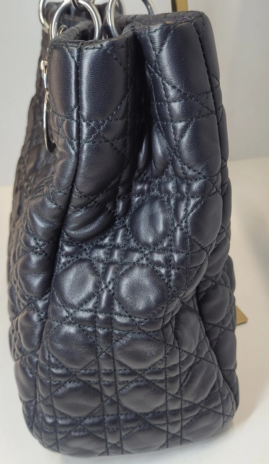 The product is a black lambskin Dior Cannage tote bag with silver hardware, designed for women. It features a classic Dior Cannage pattern on the exterior, with a matching black leather handle/strap and black canvas lining. This stylish and luxurious bag exudes sophistication and elegance, making it a perfect accessory for any outfit. The Dior brand name ensures high-quality construction and timeless design, making this tote a coveted item for fashion-forward individuals.
