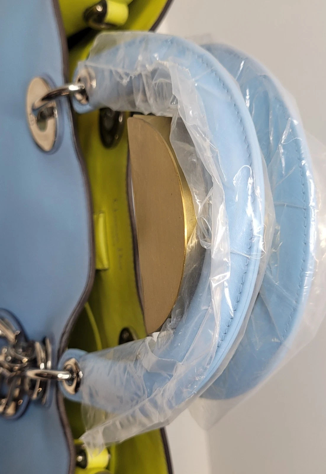 The Christian Dior Diorissimo BiColor Leather Handbag is a stylish top handle bag designed for women. Made of luxurious leather with a blue exterior and green lining, this handbag exudes elegance and sophistication. The silver hardware adds a touch of glamour, making it a perfect accessory for any outfit. The Dior Diorissimo model is a timeless piece from the renowned Christian Dior brand, ensuring both quality and fashion-forward design. All sales final