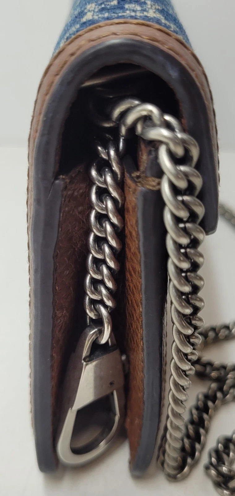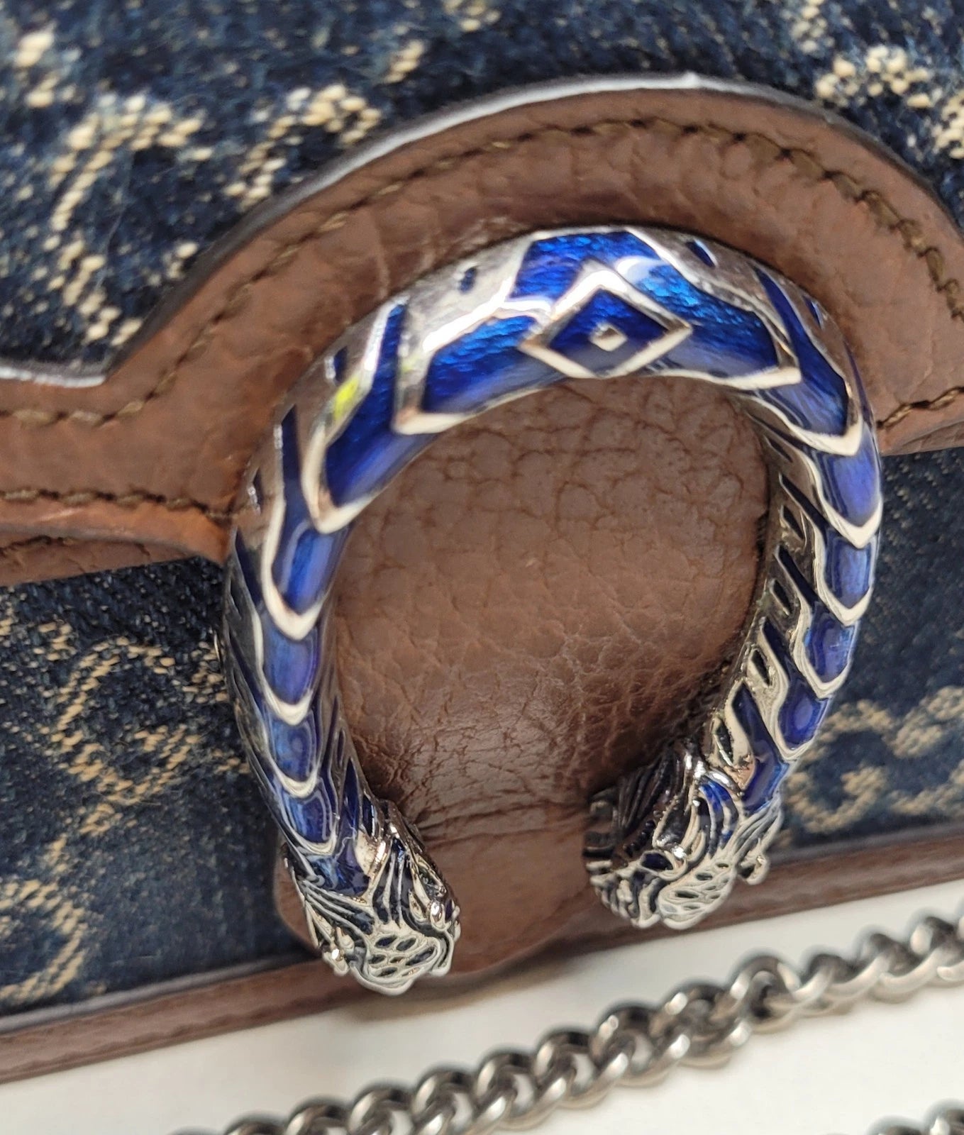 The Gucci Denim Dionysus Mini Bag is a stylish shoulder bag designed for women, featuring a silver handle/strap, silver hardware, and a suede lining. The exterior is made of denim in a classic blue color, with a beige suede lining. This mini bag from the Gucci Dionysus collection is a fashionable and trendy accessory, perfect for adding a touch of luxury to any outfit. All sales final