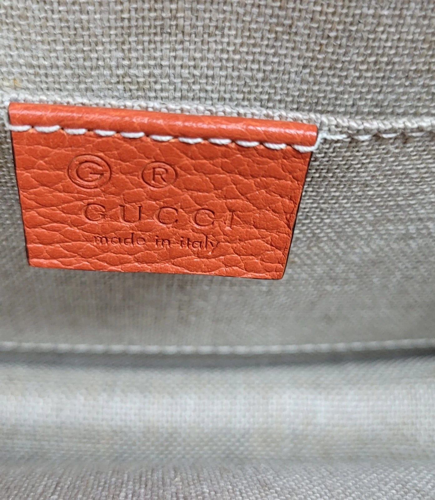 The Gucci Dollar Orange Pebbled Leather Interlocking G Handbag is a stylish and luxurious shoulder bag crafted from high-quality leather with a pebbled finish. The orange exterior and gold hardware add a touch of sophistication, while the canvas lining provides a classic and elegant contrast. With the iconic Gucci branding and interlocking G details, this handbag is sure to make a bold statement for any fashion-forward woman. All sales final