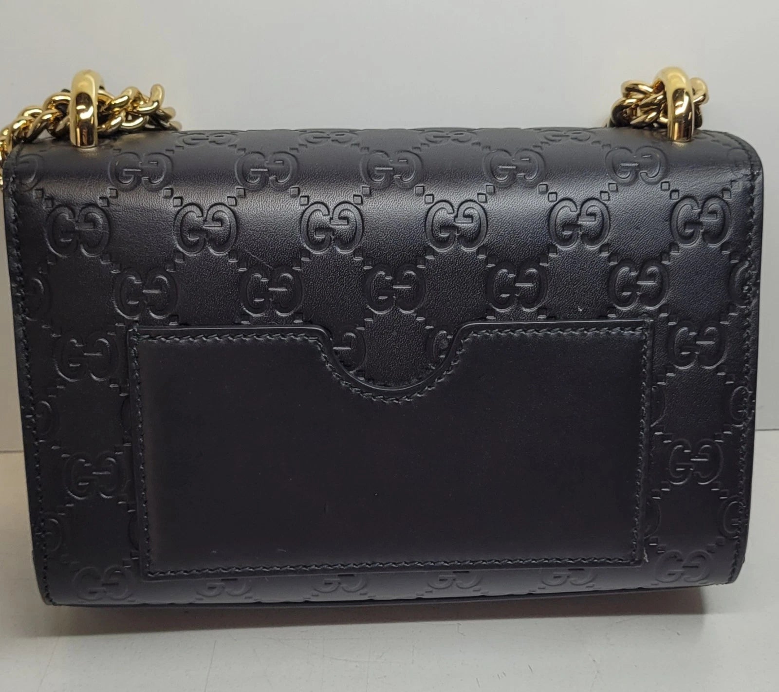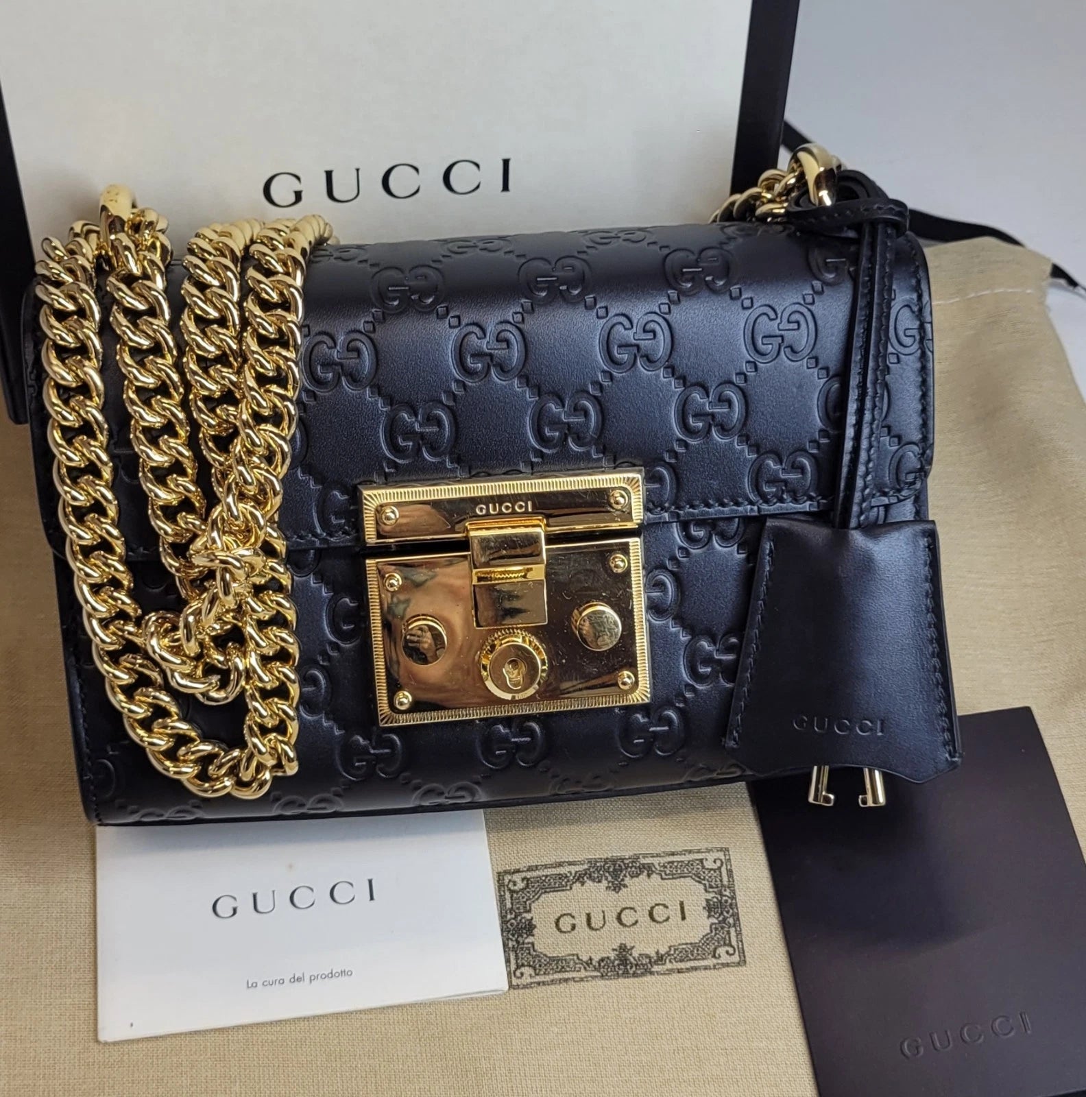 The Gucci Guccissima Black Leather Padlock Shoulder Bag is a luxurious and stylish accessory for women. This bag features a padlock closure, gold hardware, and a suede lining in beige color. The exterior is made of black leather, adding a touch of elegance to any outfit. It comes with a dustbag and box, making it a perfect choice for those who appreciate high-end fashion and quality craftsmanship from Gucci. All sales final