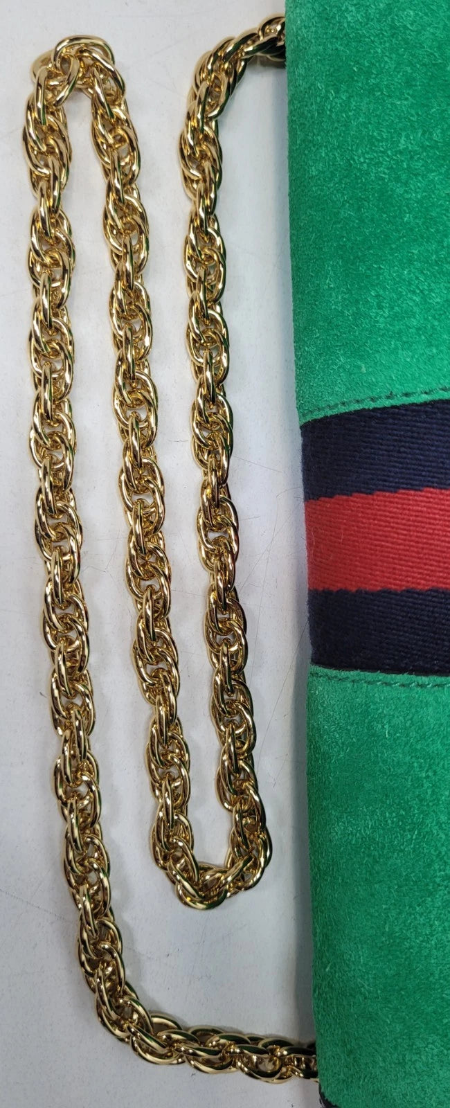 The Gucci Ophira Medium Suede Shoulder Bag is a luxurious and stylish handbag designed for women. Made with green suede exterior, blue silk lining, and gold hardware, this bag exudes elegance and sophistication. The gold metal handle/strap adds a touch of glamour, making it a perfect accessory for any outfit. As part of the Gucci Ophidia product line, this shoulder bag is a statement piece that is sure to elevate any look. All sales final