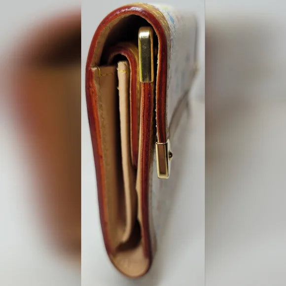 This wallet is in beautiful preloved condition. It has a gorgeous multicolor monogram leather exterior with a tan leather interior complete with extra pockets and date code. Please see all photos. Join my live show for more info. All sales final.